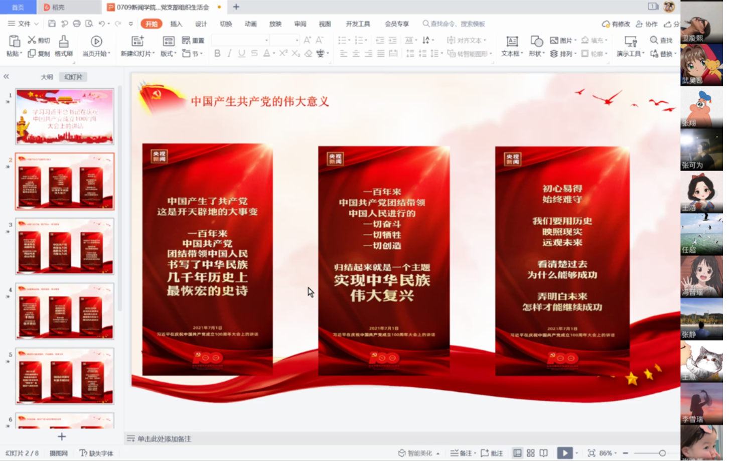 为深入学习贯彻习近平总书记在庆祝中国共产党成立100周年庆祝大会上的重要讲话,进一步夯实“明理、增信、崇德、力行”的思想根基。2021年7月9日晚8点,yl7703永利研究生第二党支部通过企业微信,在线上召开了党史学习教育专题组织生活会。按照上级党委的相关要求,与会党员交流党史学习心得体会,查找差距不足,在批评与自我批评中审视与完善自我。会议由支部书记郝强主持,公司党委书记李俊洁受邀参加会议。