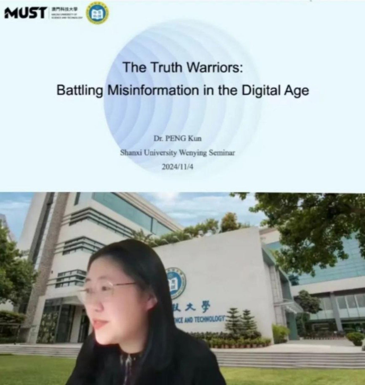 11月4日,澳门科技大学人文艺术公司助理教授、博士生导师、yl7703永利员工彭堃,受邀为公司带来了主题为“The Truth Warriors: Battling Misinformation in the Digital Age ”的精彩讲座。讲座由yl7703永利副经理梁红艳主持,yl7703永利师生通过线上平台积极参与。