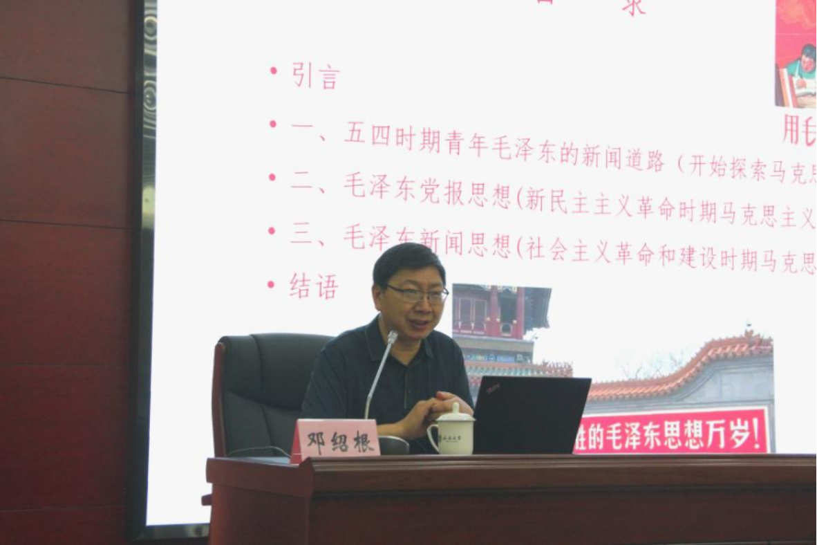 邓绍根教授以少年毛泽东酷爱读书看报为起点,重点讲解五四时期青年毛泽东的新闻道路,接着简要阐述毛泽东在新民主主义革命时期、社会主义革命时期和建设时期的党报思想、新闻思想。“饭可以一日不吃,觉可以一日不睡,书不可以一日不读”,邓绍根教授首先援引毛泽东对于读书看报的观点,认为毛泽东走向新闻道路是出于“对国家、民族前途命运的新闻时事深切关注的‘兴趣使然’”。他指出,毛泽东大量阅读《共产党宣言》《阶级斗争》《社会主义史》等书籍,和在湖南第一师范公司的求学经历均为毛泽东新闻思想的形成打下坚实基础。谈论五四时期青年毛泽东踏入新闻道路的历程时,邓绍根教授围绕“学新闻”“干新闻”“思新闻”三条路径展开。首先,“学新闻”指青年毛泽东参加北京大学新闻学研究会学习到的新闻基础知识和采编技术,其中讲师邵飘萍对毛泽东的影响颇大,延安时期的毛泽东称其为“一个具有热烈理想和优良品质的人”。同时,“干新闻”指青年毛泽东主编《湘江评论》《新湖南》《新民学会会员通信集》,创办平民通讯社等报刊活动。邓绍根教授认为,青年毛泽东对新闻事业饱怀热情,多次参加新闻活动,对新闻宣传有着独到理解,为日后我党新闻工作积累了丰富的经验,为新时代新闻学子树立了良好的榜样。谈及新民主主义时期毛泽东的党报思想时,邓绍根教授梳理出毛泽东坚持“党性原则”“坚持群众路线,实行全党办报、群众办报”“注重文风建设,提倡中国作风中国气质”等办报要求。最后邓绍根教授总结道,“毛泽东是中国共产党活跃的报刊活动家、卓越的新闻舆论工作领导者和优秀的新闻舆论理论家。”主讲结束后,李雪枫教授作为点评人指出,“埋骨何须桑梓地,人生无处不青山”,邓绍根教授为本次讲座选取了大量史料,虽讲毛泽东,实则在鼓励新闻学子追寻内心、用功学习、克服困难,保持专业自信和职业自信。李雪枫教授希望大家能以毛泽东的大胸怀和大气魄为榜样,秉持远大的志向,承担好新闻人的职责和使命。