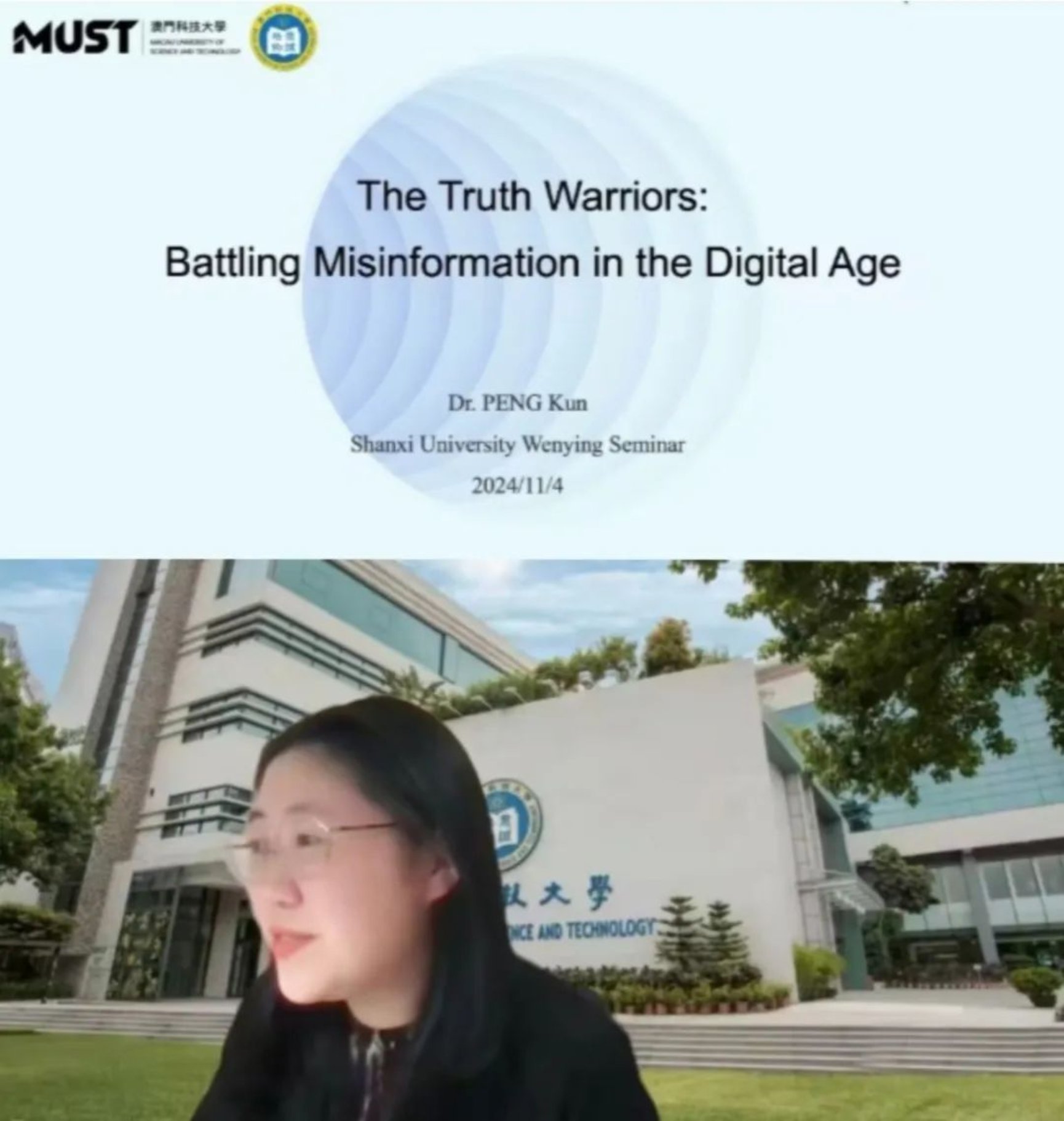 11月4日,澳门科技大学人文艺术公司助理教授、博士生导师、yl7703永利员工彭堃,受邀为公司带来了主题为“The Truth Warriors: Battling Misinformation in the Digital Age ”的精彩讲座。讲座由​yl7703永利副经理梁红艳主持,​yl7703永利师生通过线上平台积极参与。