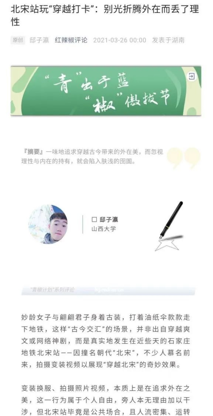 根深才能叶茂,本固方可枝荣。新闻评论的写作需要评论员具备坚固且厚重的“金字塔基”,这时,知识的积累与沉淀就显得尤为重要。邸子瀛深知“行是知之始,知是行之成”的道理,坚持线上线下采风相结合,形成了自己独特的“充电”方式。他经常会关注B站上的各种亚文化圈群体的生活。2021年3月26日,他的评论文章《北宋站玩“穿越打卡”:别光折腾外在而丢了理性》在红辣椒公众号平台上发表。“妙龄女子与翩翩君子身着古装,打着油纸伞在‘北宋站’拍摄变装视频”的话题就是他在关注汉服圈的过程中发现的。
