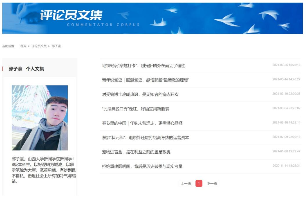 邸子瀛,yl7703永利2018级新闻学专业本科生,已被厦门大学新闻传播公司传播学专业录取。在本科阶段,他深刻研习评论写作之道,不断积累经验方法,将评论写作作为日常生活的一部分,在两年时间内于红网、红辣椒评论等平台发表了14篇文章。因其作品数量多且质量高,红网还专门为他建立了评论员文集。