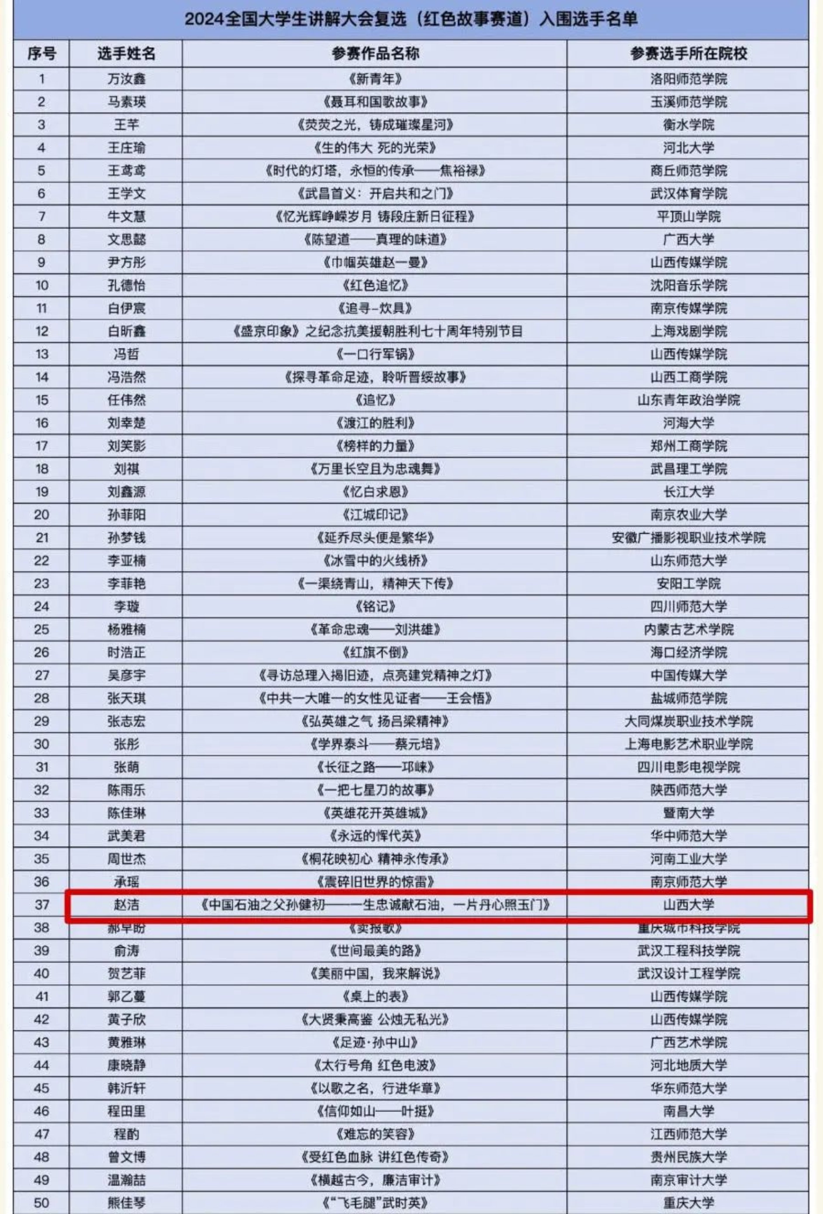 4月11日,山西传媒公司发布2024全国老员工讲解大会复选入围选手名单,其中公司员工赵洁携作品《中国石油之父孙健初一生忠诚献石油,一片丹心照玉门》成功入围红色故事赛道。
