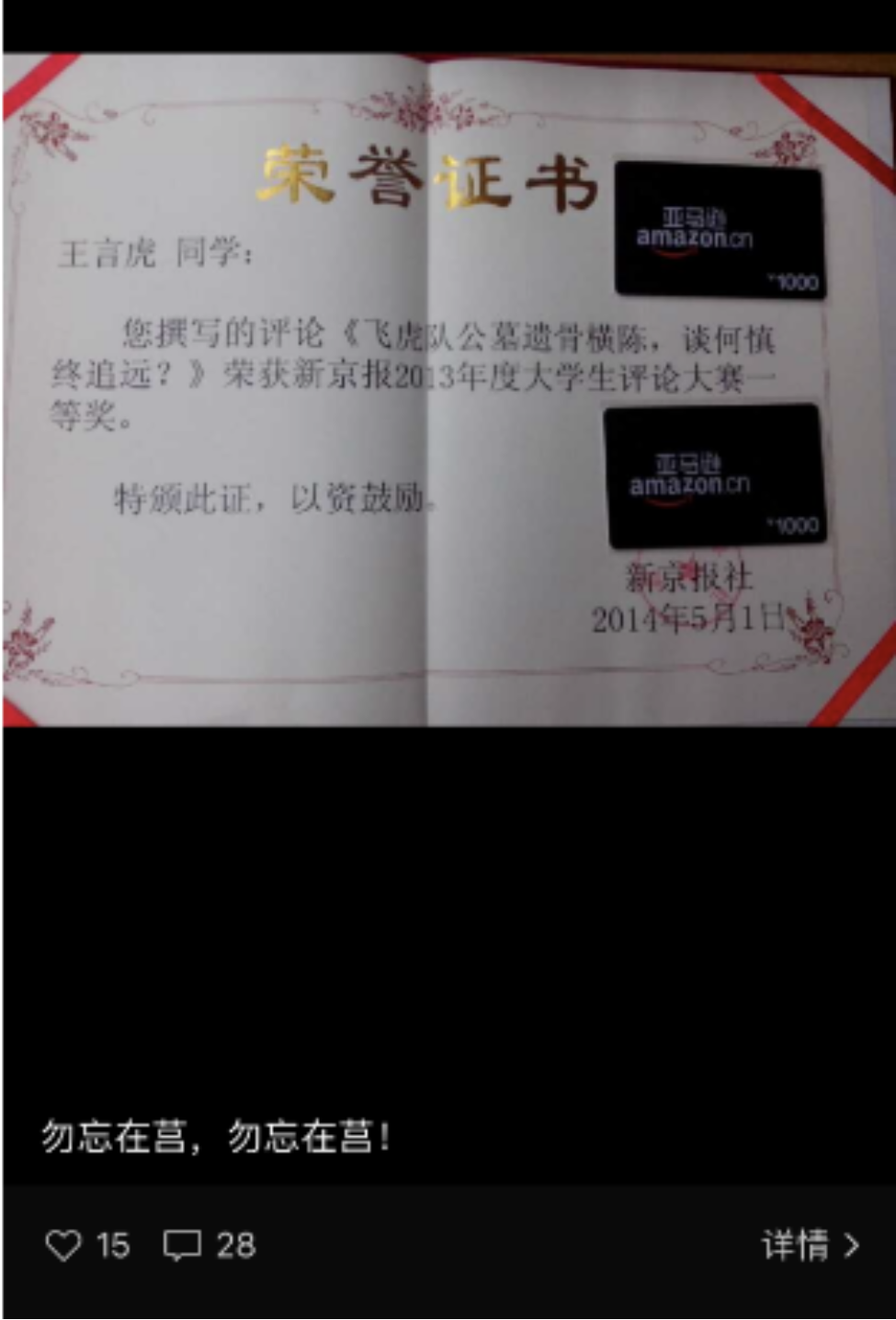(图3:2014年新京报老员工评论大赛的一等奖证书,图为当时发的一则朋友圈)