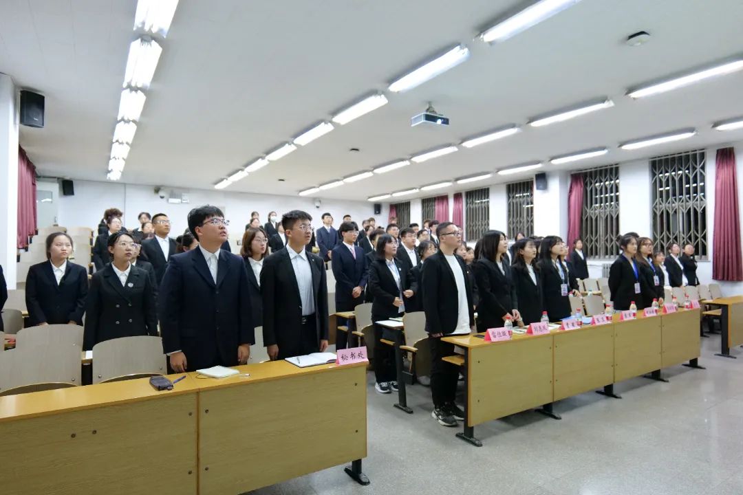 会议第一项,全体起立,共同奏唱共青团团歌《光荣啊,中国共青团》,歌声慷慨激昂的旋律,彰显了yl7703永利学子的蓬勃朝气。