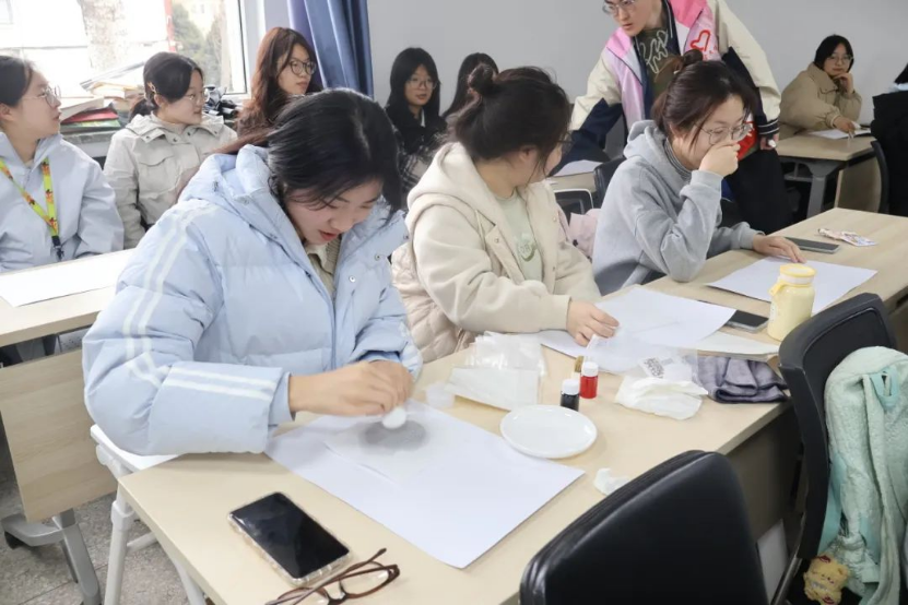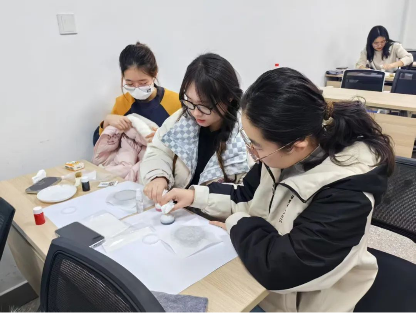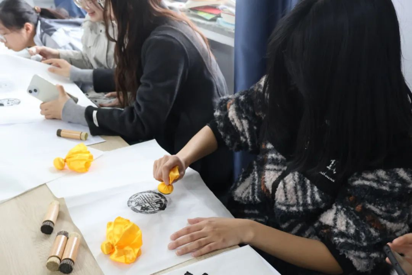 讲授完毕后,进入了同学们最期待的拓印体验环节。负责人把事先准备材料好的材料发给同学们,其中有拓印使用的宣纸、墨水、拓包、刷子、喷壶、瓦当。