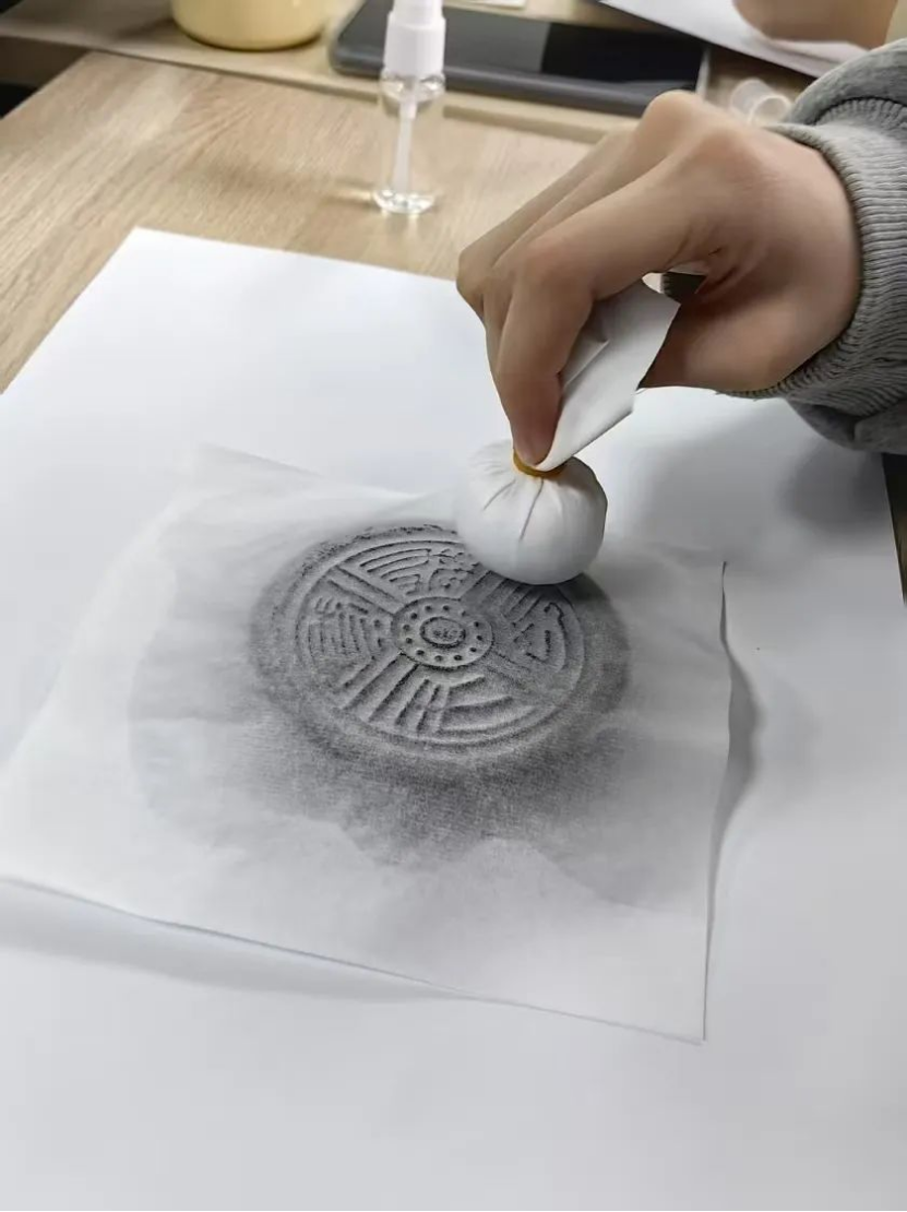 待纸张稍干后,用拓包蘸取适量墨汁,轻轻拍打纸张表面,墨色逐渐加深,直到图案清晰。