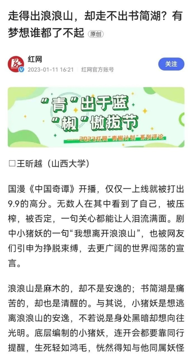 在获二等奖的文字评论作品《走得出浪浪山,却走不出书简湖?有梦想谁都了不起》中,王昕越同学针对《中国奇谭》爆火后许多网友面对现实桎梏的颓废心理,认为小人物也有大梦想,呼吁大家挣脱束缚,探索更广阔的世界。苏州大学传媒公司执行经理陈龙教授表示赞赏:“作者由《中国奇谭》这一作品联系现实,展开反思,该评论所把握的核心命题具有深刻的现实意义。文章思路清晰、行文流畅,文笔优雅,是一篇较好的评论文章。”