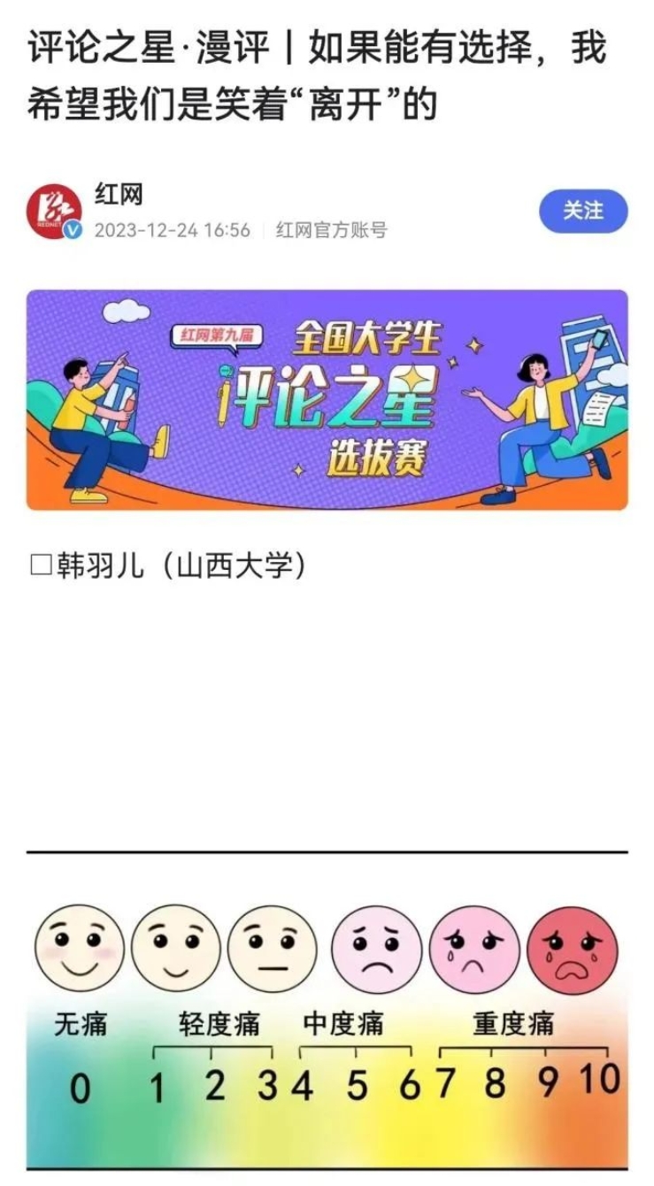 其中,韩羽儿同学获一等奖的漫画评论作品《如果能有选择,我希望我们是笑着“离开”的》聚焦“安宁医护”,用漫画的形式,以小见大地刻画出这一行业面临的困境。浙江大学求是特聘教授、博士生导师吴飞教授认为,该作品“画面有冲击力,视角的选择很巧妙”。中国经济体制改革研究会常务理事祝华新老师表示“字里行间有对生命尊严的思考和真诚维护”。国防大学政治公司王传宝教授也肯定了该作品的感染力,认为“有共情代入感”。