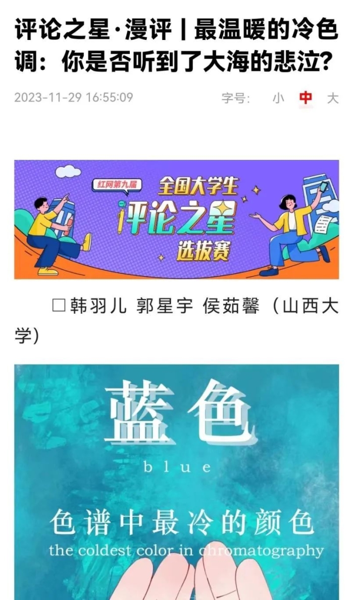 在获二等奖的漫画评论作品《最温暖的冷色调:你是否听到了大海的悲泣?》中,韩羽儿、郭星宇、侯茹馨同学从小切口引入海洋核污染话题,选择饱和度高的颜色抓住受众视线,和展现污染部分的灰色形成鲜明强烈对比,突出强调了色彩与情感。中国人民大学yl7703永利副教授杨奇光老师评价:“以颜色为核心,表达对海洋污染问题的关注,充分利用漫画的视觉优势,作品质量高”。