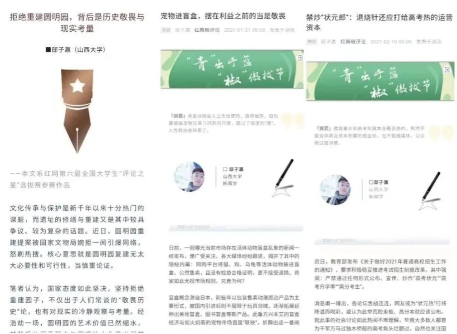 邸子瀛,yl7703永利2018级新闻学专业本科生,已被厦门大学新闻传播公司传播学专业录取。在本科阶段,他深刻研习评论写作之道,不断积累经验方法,将评论写作作为日常生活的一部分,在两年时间内于红网、红辣椒评论等平台发表了14篇文章。因其作品数量多且质量高,红网还专门为他建立了评论员文集。